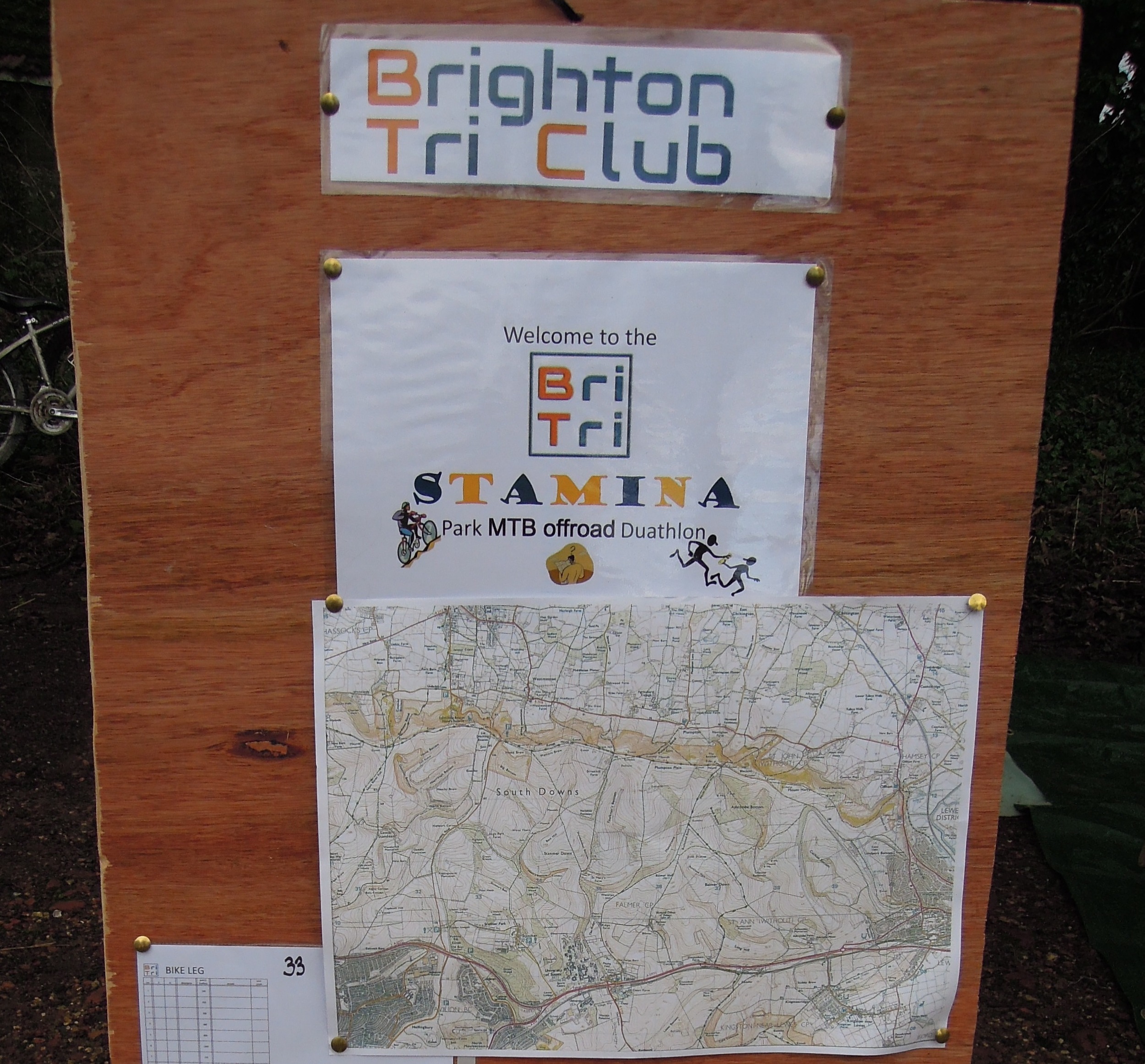 Each team was given a series of photos to follow to navigate the c.3.2km undulating running course around the park and were then set off at 2 minute intervals. Upon their return to the HQ they were given an OS map and a list of grid references where a card with a specific photo of a Brighton landmark had been placed. Each grid reference was worth a different number of points and the teams had 2 hours max to jump on their mountain bikes and gain as many points as possible and before heading back to the HQ, parking their bikes in transition and going out on to the run course for a final lap.