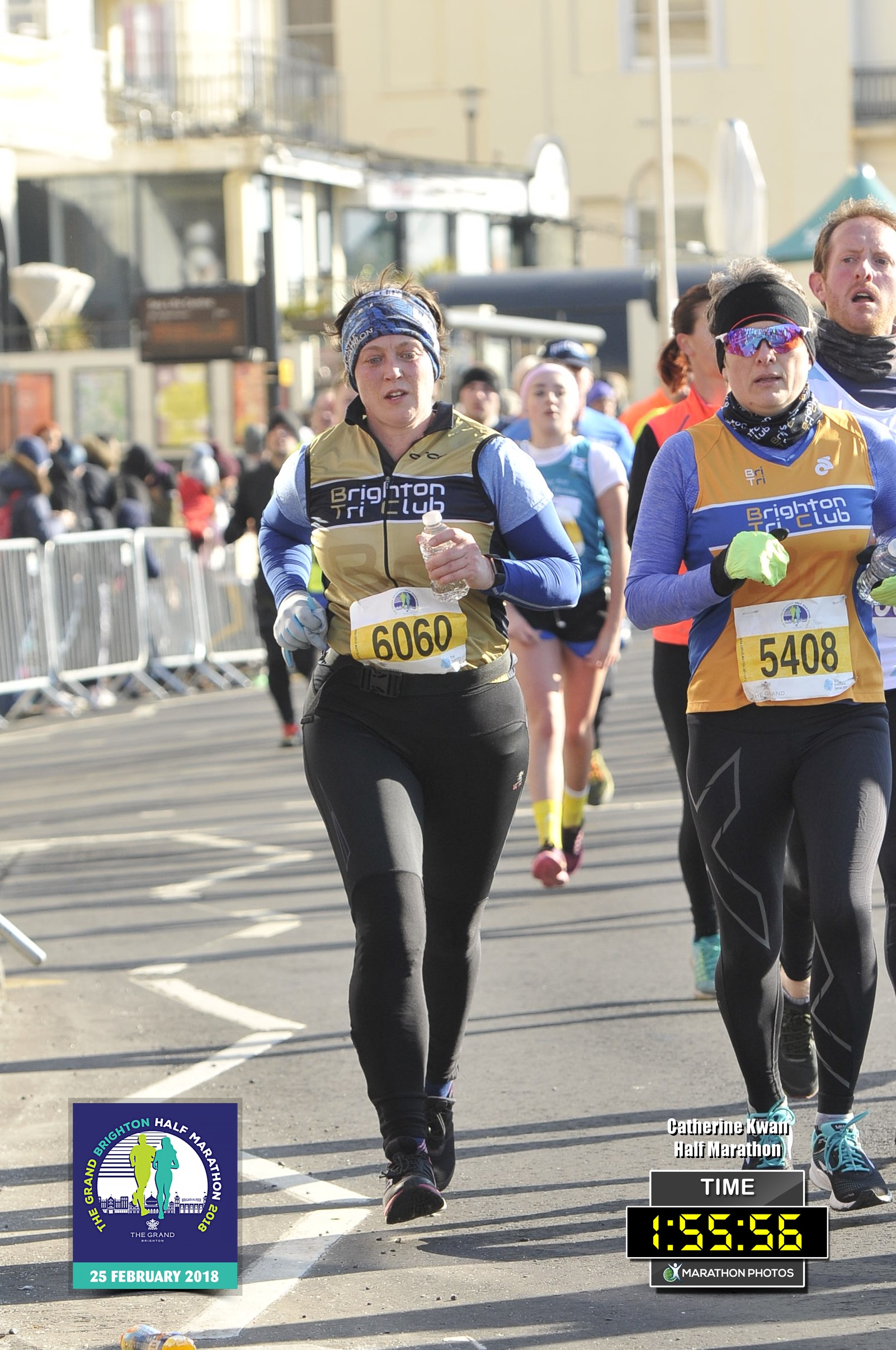 We hit Hove Promenade, and unfortunately the last 5 Km was into the Beast from the East headwind. Cathy tucked in to draft behind me, and I tried picking up the pace to 5:20/Km. A little chirp from behind me: “You’re getting faster! I can’t go any faster!” “No, I’m not! Stay with me!” Nevertheless, I knew we were well on target for our goal, and cruised down the final stretch to cross the line in a formidable 1:55:56.